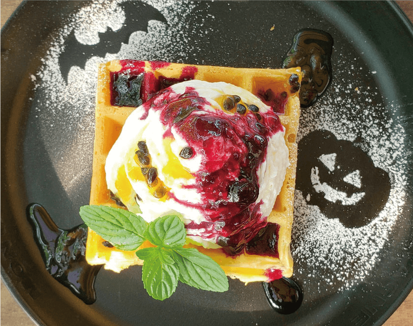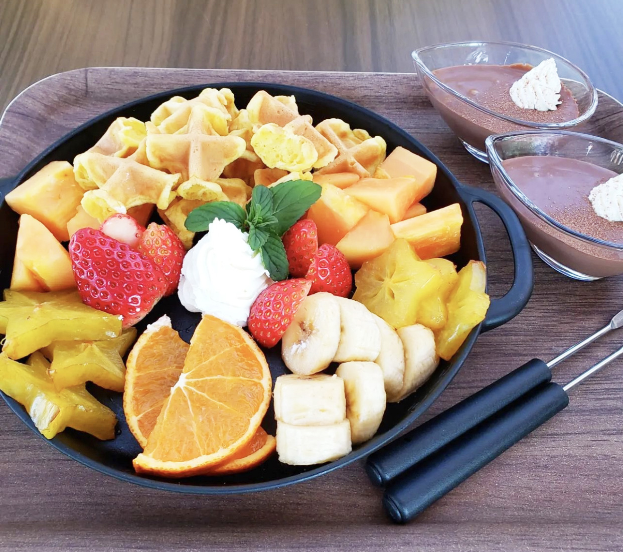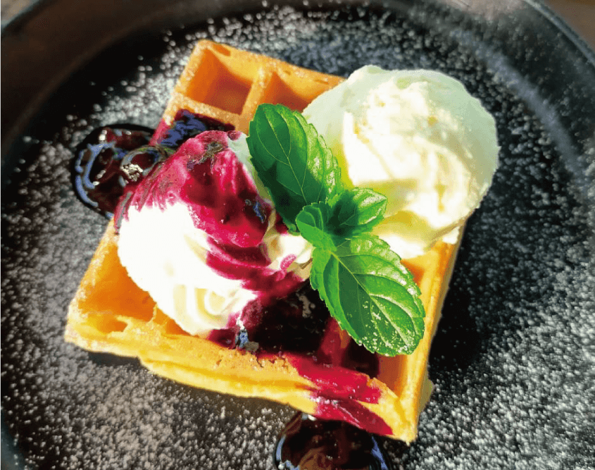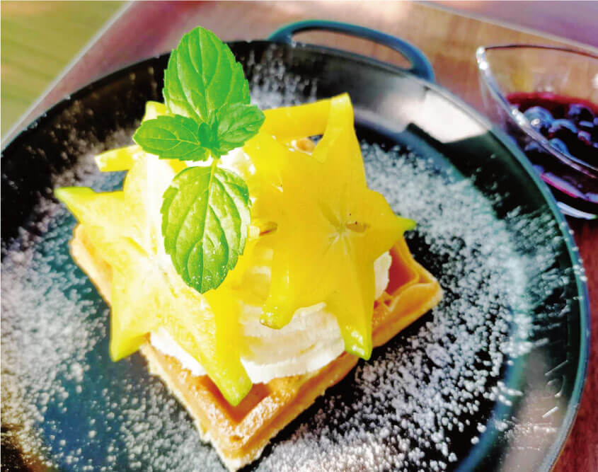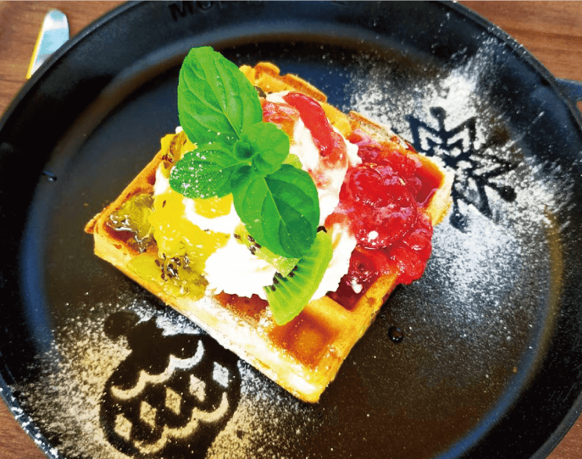 旬のフルーツをトッピングした「ワッフルサンド」を新メニューに追加しました。ワッフル・生クリーム・フルーツのハーモニーをお楽しみください♪ 冷めても固くならずにモチっとしっとりなワッフルです。テイクアウトにもお勧めです。