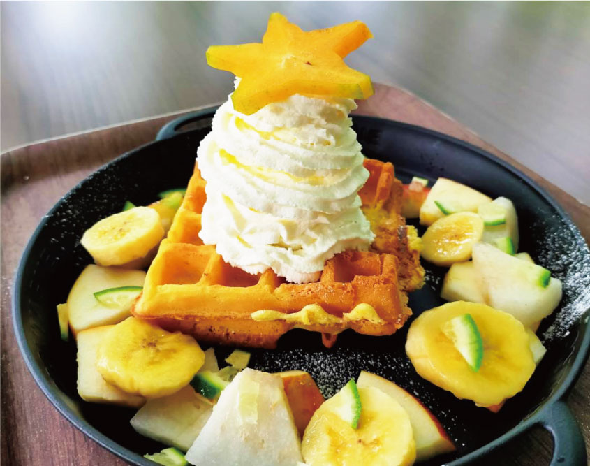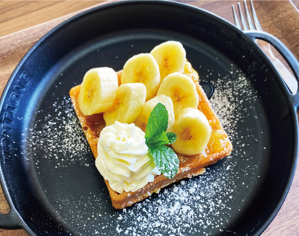バナナをトッピングした「バナナワッフル」はカフェの一推しです。北海道から取り寄せた純正生クリームは口の中で粉雪がとろけるようなまろやかさです。