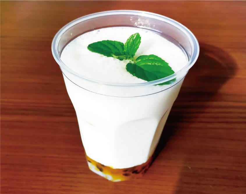 食べられるラッシーナタデココ、パッション入り、パッションフルーツのタネのパリパリ食感はクセになる味覚、ビタミンたっぷりのヘルシーメニューです。